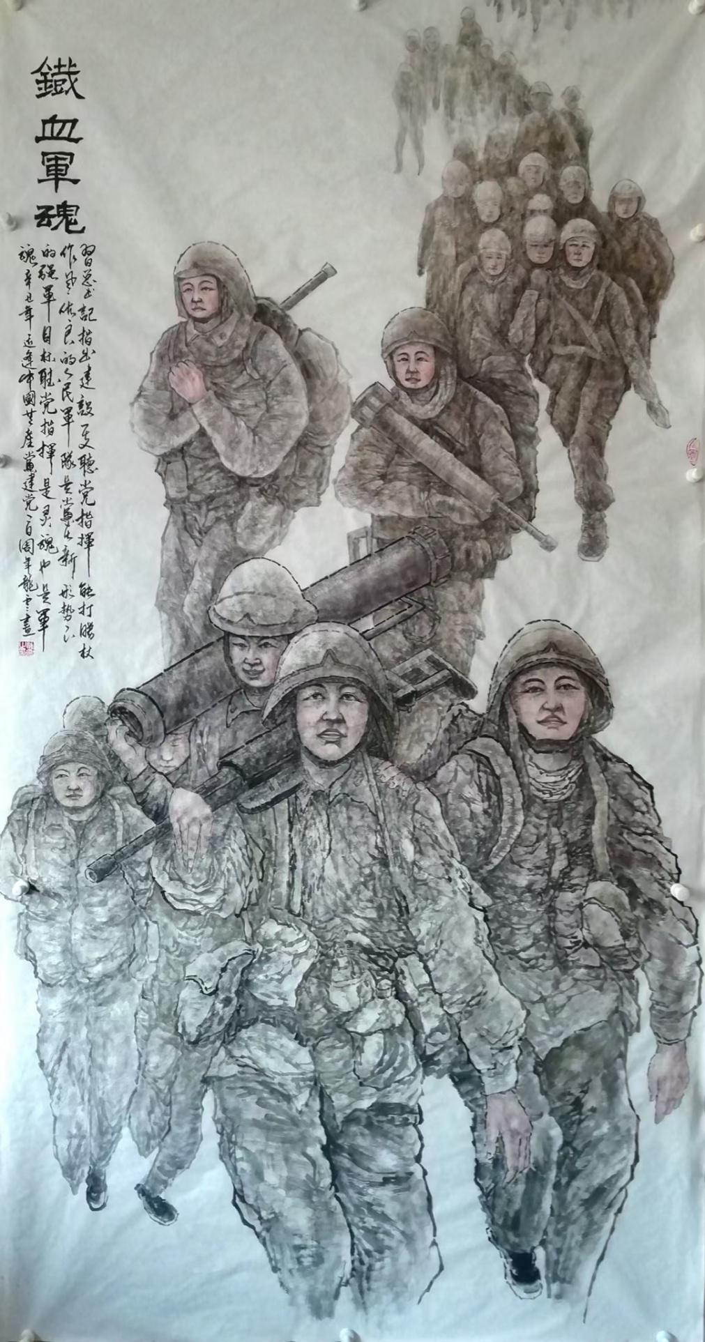 龙云在创作《铁血军魂》系列作品时表示,2月19日反映边境任务部队官兵卫国戍边英雄事迹的报道,在社会上引起强烈反响。在斗争中负伤的祁发宝和牺牲的陈红军、陈祥榕、肖思远、王焯冉4位烈士的壮举,深深震撼每一位中国人的心。特别是烈士陈祥榕曾深情表白,“清澈的爱,只为中国”;烈士肖思远曾在日记中表达“走在喀喇昆仑,我们就是祖国的界碑,脚下的每一寸土地,都是祖国的领土,无比自豪”。边防军人们宁愿流血,不失寸土,正是有了当代中国军人,国家才会安全,人民才能幸福。我们以艺术的方式,致敬边防英雄,致敬中国军人,表达对高原兵的问候。他们是最可爱的人,他们共同铸就了铁血军魂,他们值得人民尊敬和讴歌!